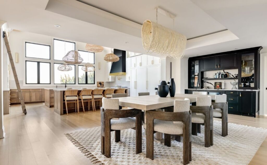At the center of the space, dual islands create a dynamic layout that supports both everyday cooking and entertaining on a grand scale. One island acts as a working hub, aligned with cooking and prep zones, while the second island invites guests to linger, dine, or simply enjoy the view. The cabinetry is tailored to reinforce the room’s strong geometry, using clean lines and thoughtful rhythm to ground the volume of the high ceilings.