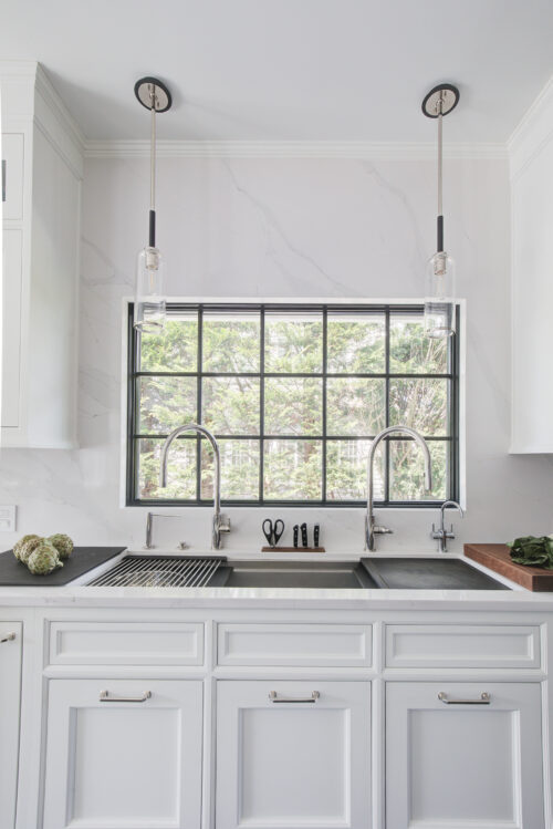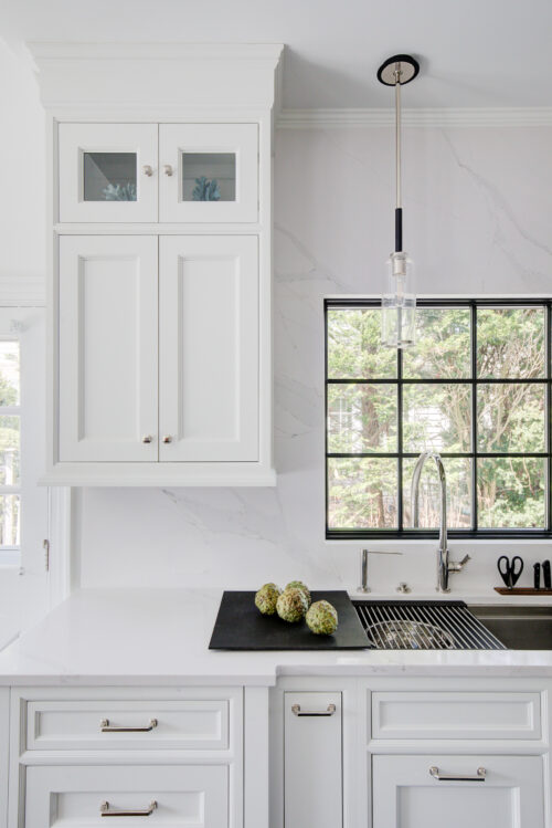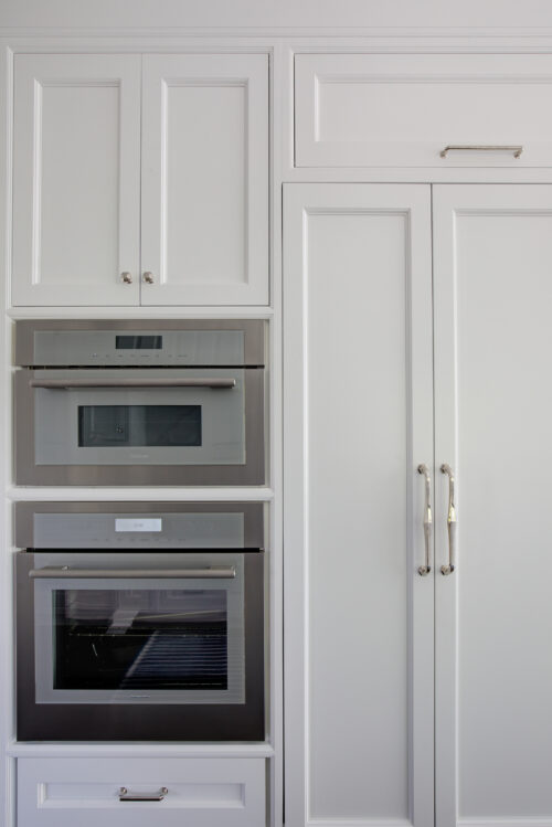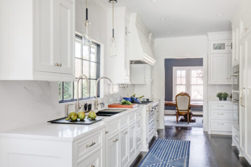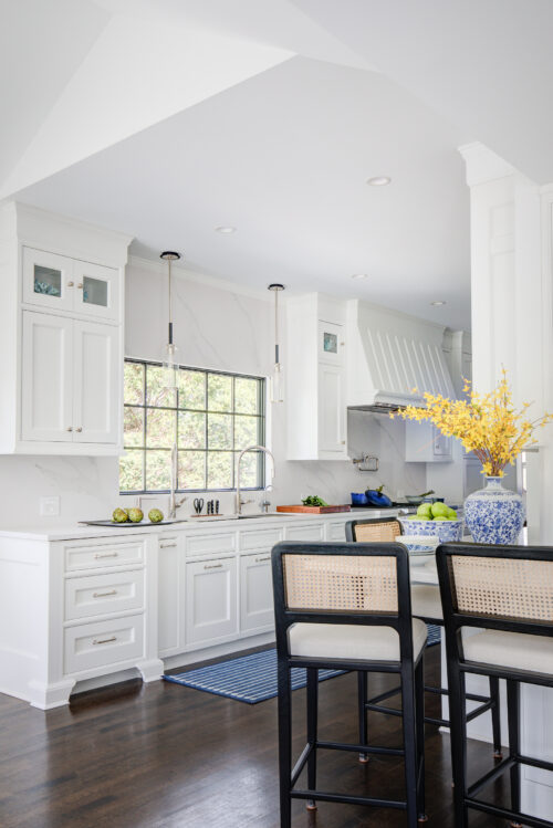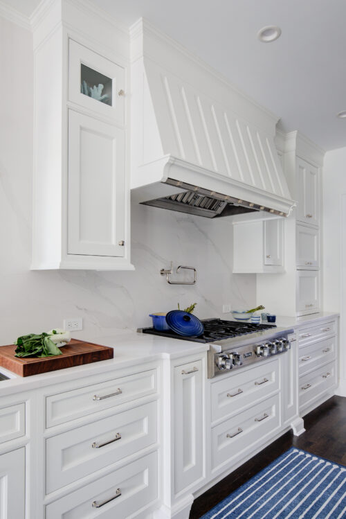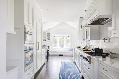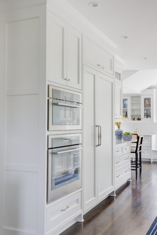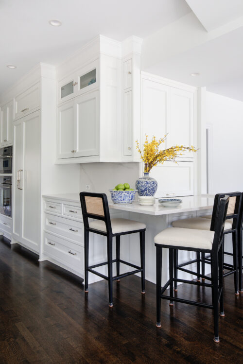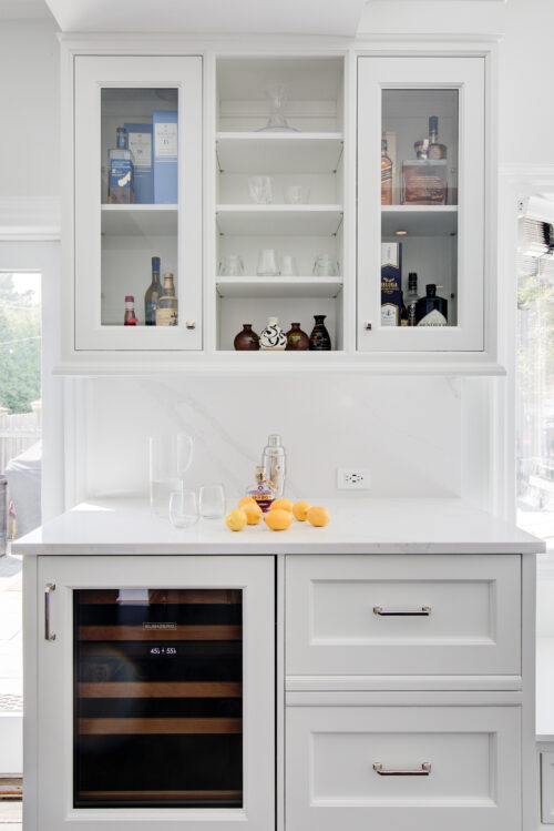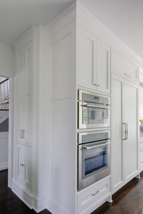 The owners desired a renovation that was both transitional and classical. They chose Rutt Ruskin cabinetry with walnut drawers for their modest galley-style kitchen layout. The space was equipped with Sub-Zero, Wolf, and Cove appliances, along with every pullout and rollout imaginable. Featuring a classic Rutt Ruskin hood and Blum Servo-Drive lifts on the doors, this project lacked nothing. The ceiling was opened up to create a spacious dining area and a functional mudroom, complete with a mirror and a well-stocked bar for unwinding after a long day.