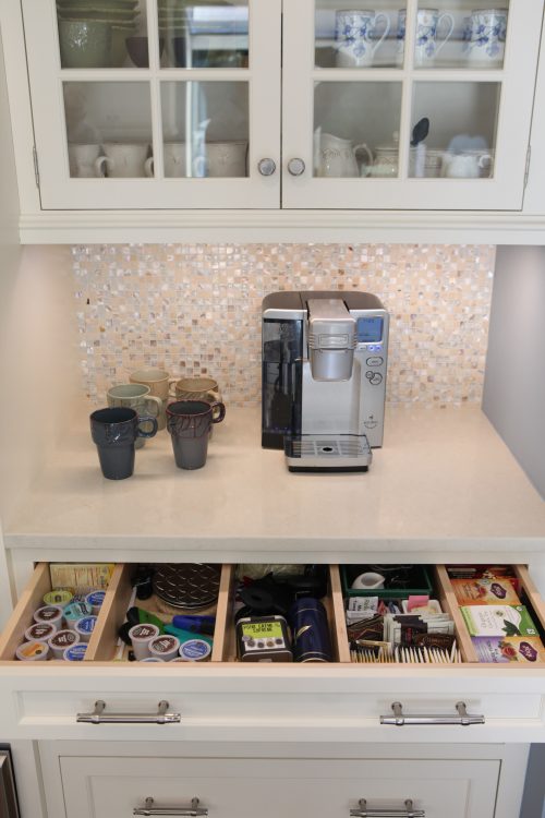 The original kitchen in this lovely North shore long island contemporary home was isolated at the end of the house back by maids room, mud room and laundry room. The design challenge, conceived by Rae Packard, CKD of Packard Cabinetry was to open up to the right of the range wall in order to feel connected to the space to the living/family room. Sink wall was given and the back wall was loaded with tall items.The island in dark cherry with double edged Taj Mahal quartz counter top, is a lovely contrast to the linen white cabinetry by Rutt Hand Crafted Cabinetry on the perimeter. Tall wall , built into the wall to provide the space on the eating side of the island; with Sub zero, wall ovens warming drawer, and coffee bar. L shaped kitchen with island, transitions into eating area with an entertainment storage run of cabinetry in dark cherry wood. existing greenhouse brings in the exterior light beautifully.the bar transitioning from the kitchen to the formal dining room was visible coming down the hallway from the front foyer so it had to reflect the antiques in the home and stand on its own.