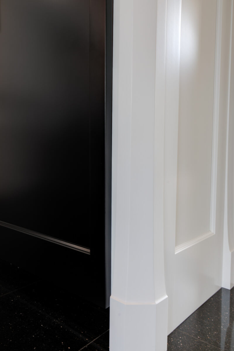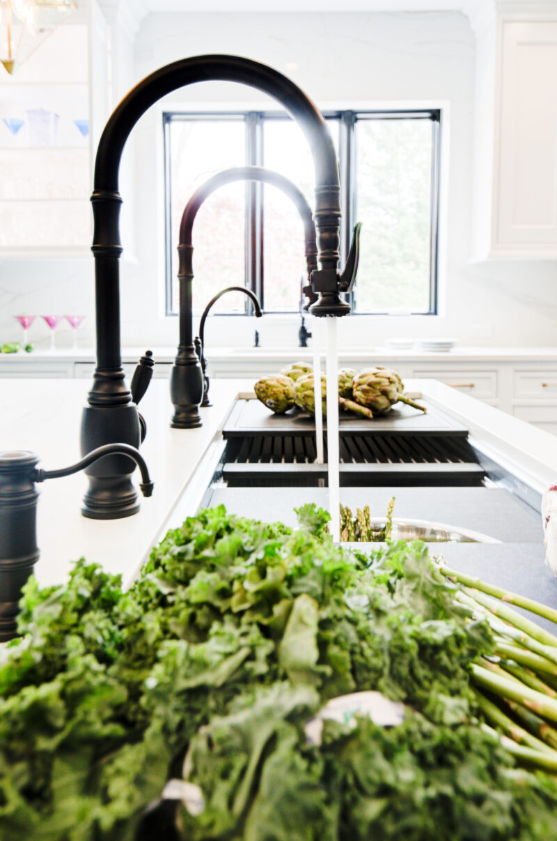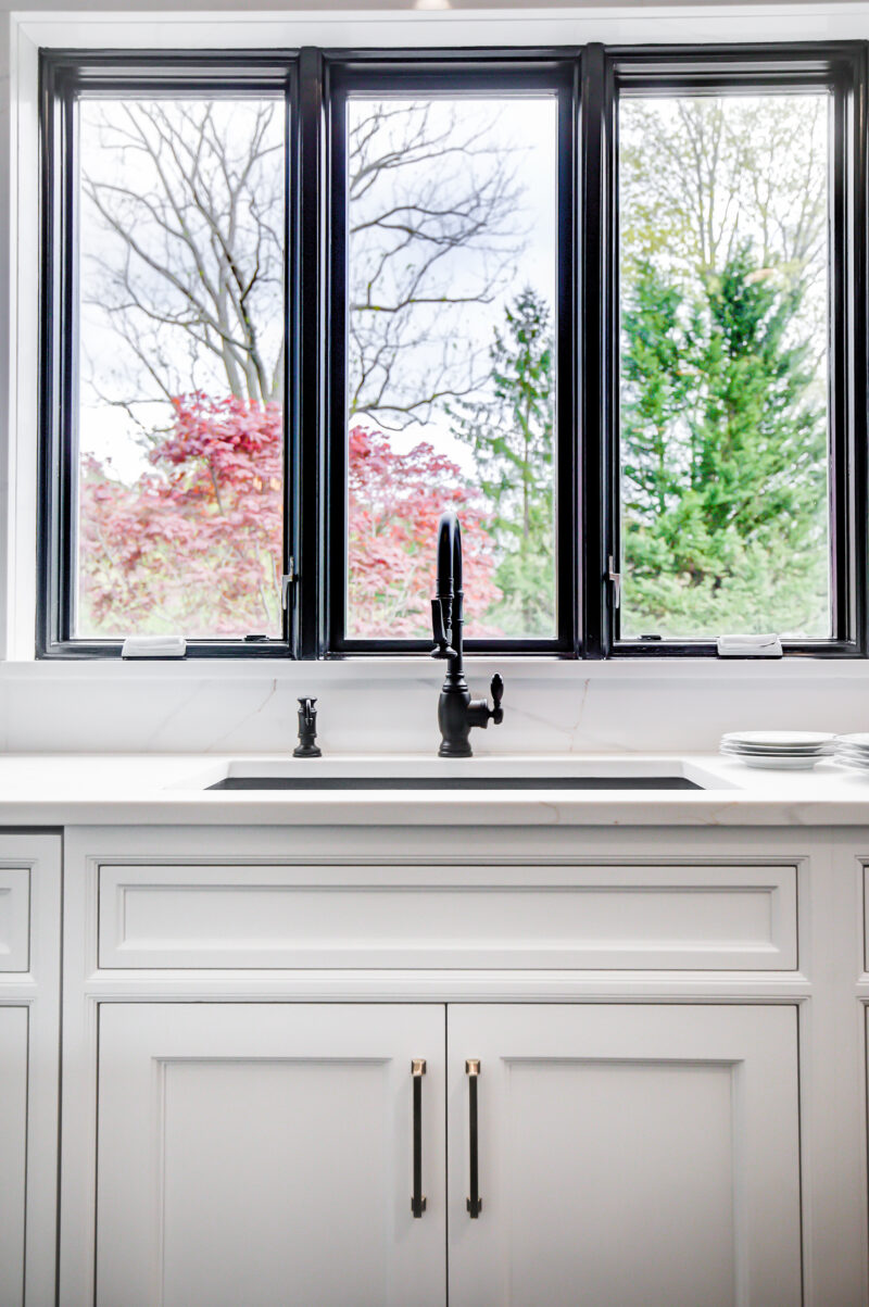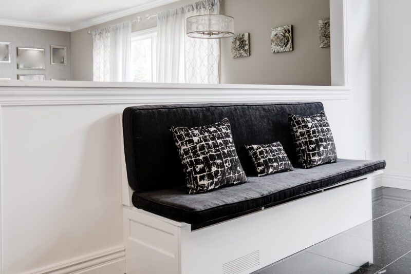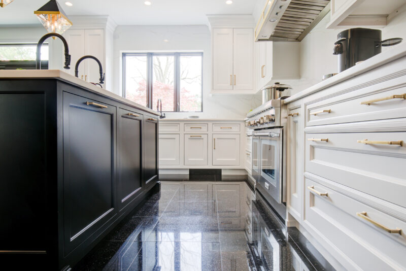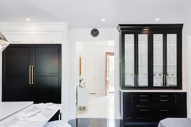 This jaw-dropping black cabinet kitchen in Long Island NY is modern and sleek and creates a calming space for preparing meals. Utilizing two tones in the cabinetry creates a clean and striking design that will "wow" any visitors of this home.