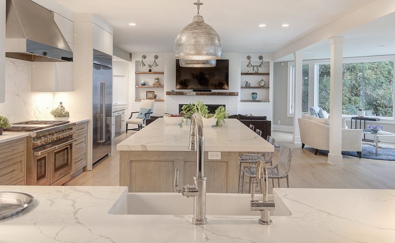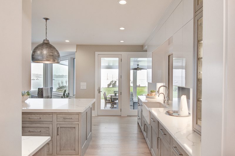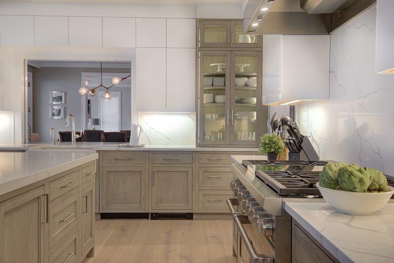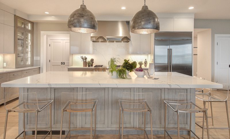 This modern white and gray kitchen design boasts beautiful custom cabinets, stainless steel, stunning light fixtures, gorgeous floors, and a chef's oven, hood, and range.