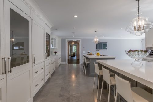 By expanding the footprint of this classic red brick colonial in Manhasset, the size of the kitchen was enlarged considerably. The new space allowed for a second island with a Galley work station, a bar entertainment area, as well as additional seating. The blue islands create some contrast with the otherwise white kitchen cabinetry but maintain a calm, serene space. The metallic tiles behind the range provide a strong focal point. The straight flush cabinetry along the tall appliance wall conceals an entrance into the walk-in pantry. Guess which door that might be!