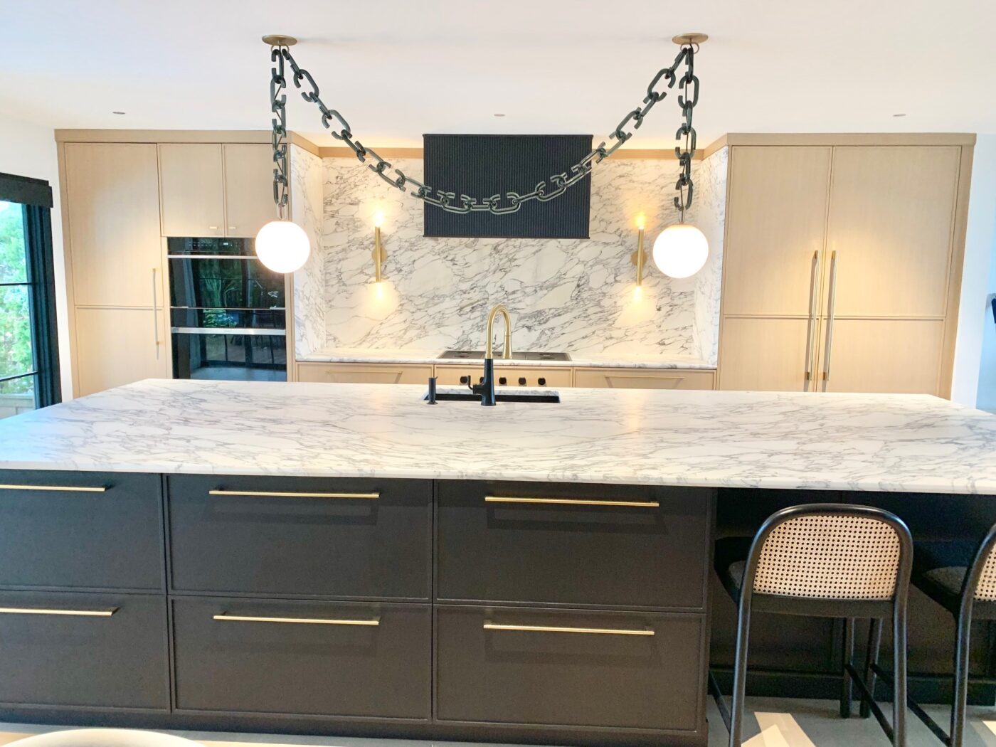 This beautifully unique, modern kitchen located in the Ocean Bay Waterfront features a mixture of dark and light cabinets, brass accents, and attention-grabbing lighting fixtures.
