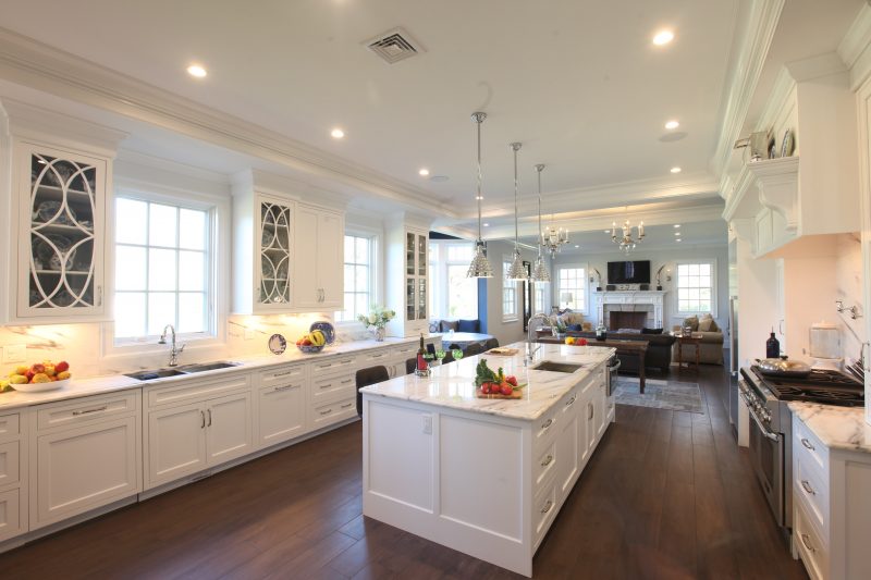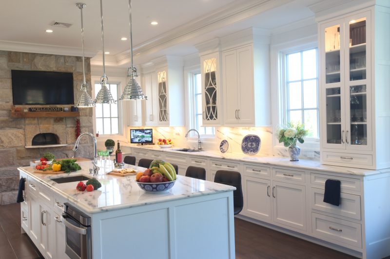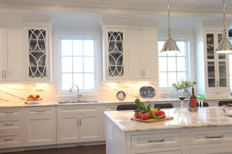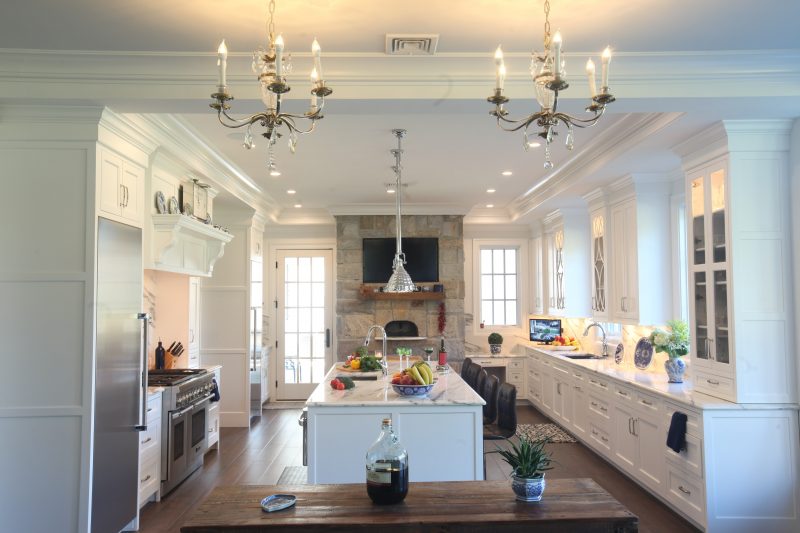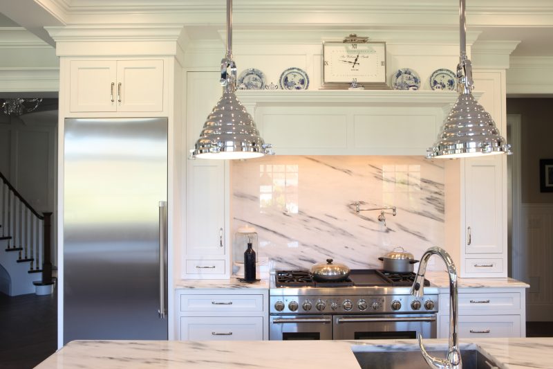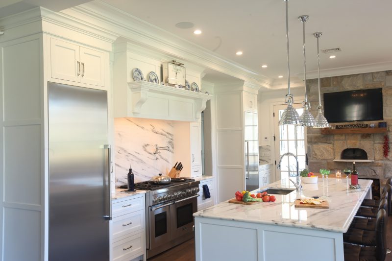 This newly-built stone colonial is classic in style and proportion. The exterior architecture, accented by the reproduction custom-made front door, is reflected by the well-proportioned interior classic white Hampton style cabinetry. The white inset cabinets are contrasted to the massive stone chimney which houses a pizza oven. The large center island not only provides a central gathering for the family with ample seating, but also draws the two opposing walls together while separating the cleanup zone and the cook zone. The main sink is highlighted by curvilinear glass wall cabinets. The cook zone is featured by a large wood hood with pull-out spice storage and drawn to the island by a prep sink and flanked by separate refrigerator and freezer units.