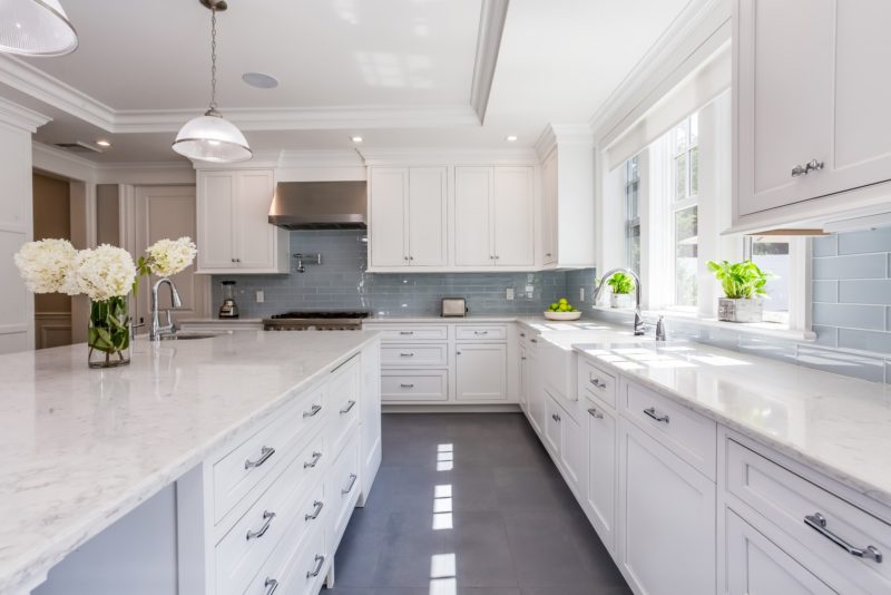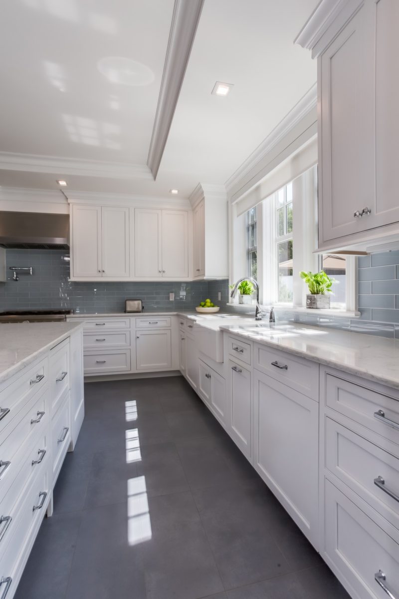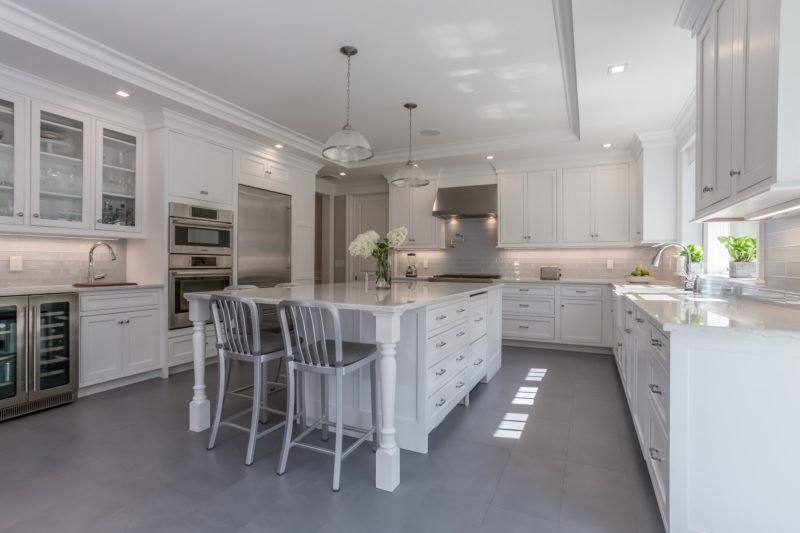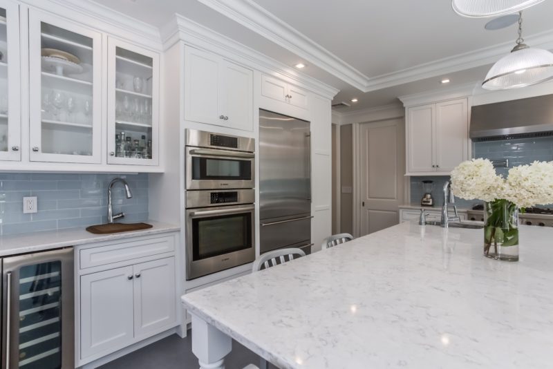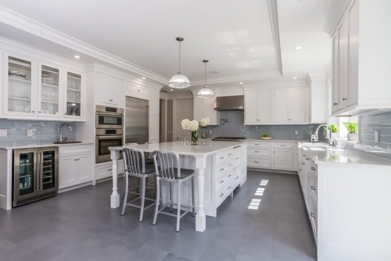 The total renovation of the first floor of this Port Washington home gave the homeowner a substantially larger space to recreate a full service island. The Mouser Central cabinetry is a traditional inset recessed panel door and drawer in a cool shade of white paint.