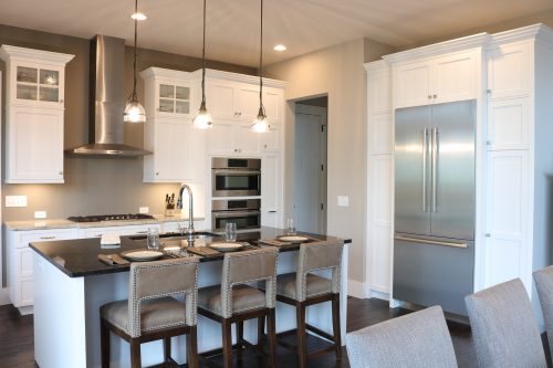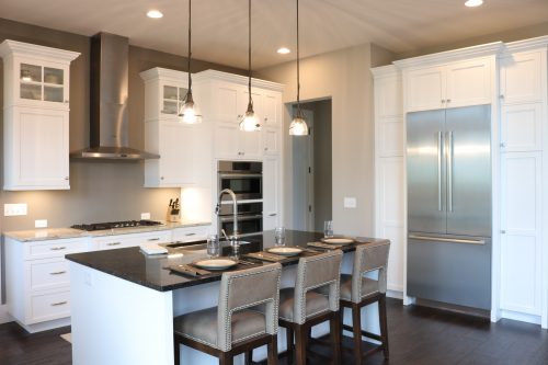 Featured in the 2018 Parade of Homes, this contemporary kitchen makes use of multiple work and prep areas. Incorporating lines created by the detailed crown and light molding are carried throughout the space. Symmetry and balance that complements the clients design style.