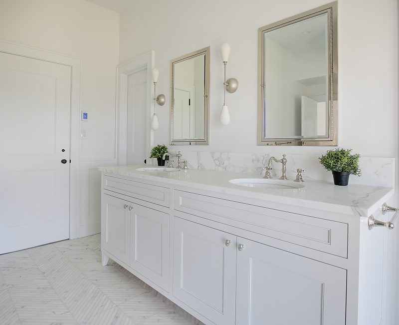 This modern white Sands Point, NY bathroom boasts beautiful custom cabinets, incredible lighting from both natural lighting and sconces, and an upscale feel.