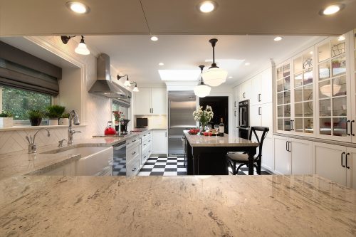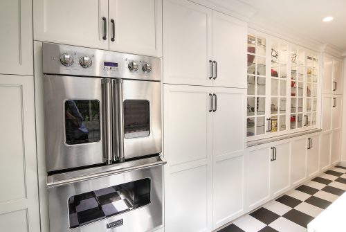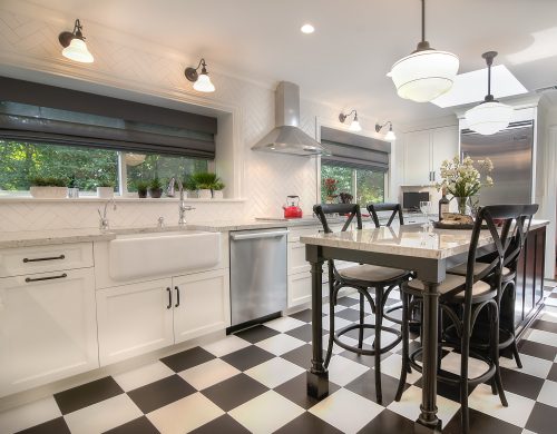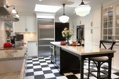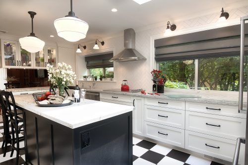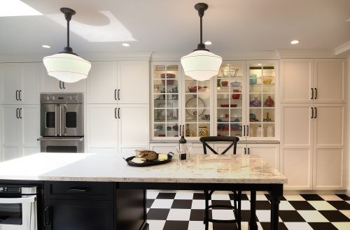 This mid-century condo was brought into the 21st century with a black-and-white theme and full overlay recessed panel door style from Rutt Handcrafted Cabinetry. Designers from Packard Cabinetry reconfigured the out-of-date layout by adding an island with seats, opening the wall between kitchen and dining, and creating dramatic storage floor to ceiling storage punctuated by some display cabinets on the long wall. The black island adds a dramatic effect against the checkerboard floor, light fixtures, and window shades.