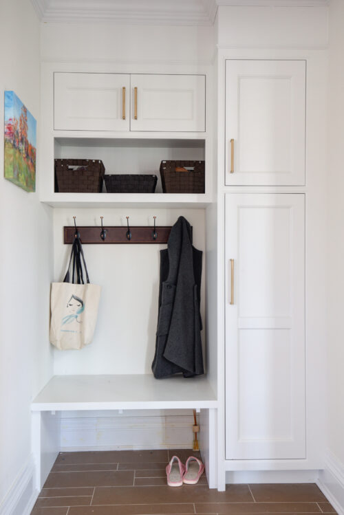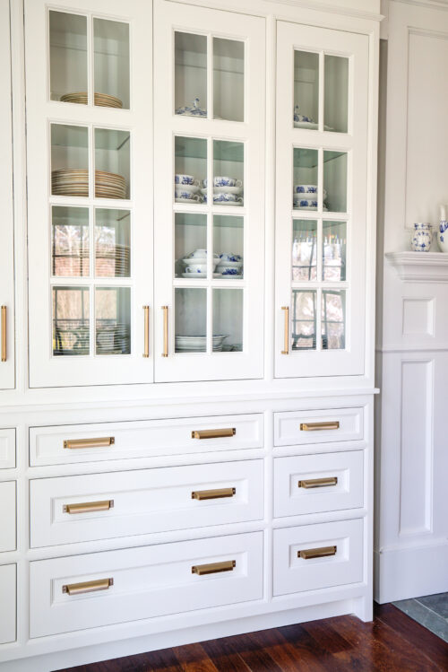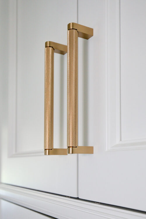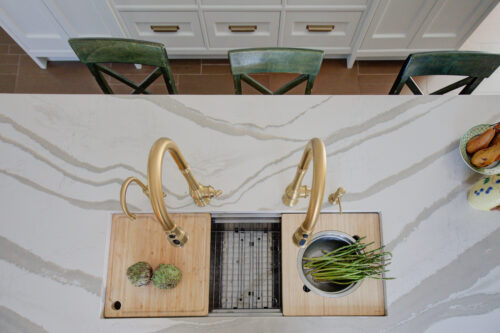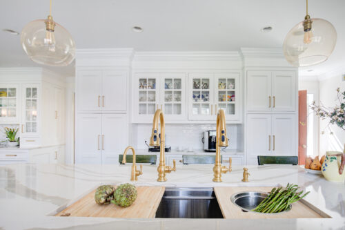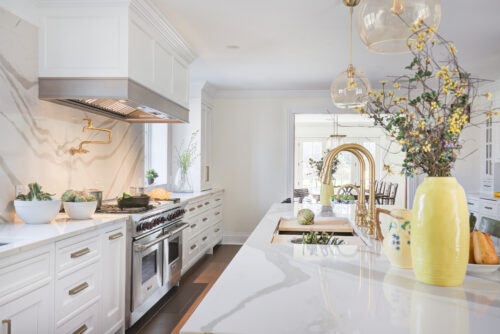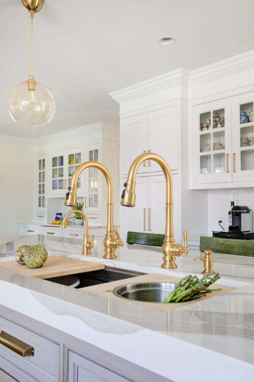 In a recent Villages of Muttontown renovation, our goal was to seamlessly integrate the various work zones in a long, narrow kitchen space. We achieved this by incorporating two islands and a sit-down table, creating distinct areas for food preparation and socializing. The kitchen features a dedicated food prep zone for a 60" commercial range, a galley workstation, and a sitting area on one of the islands. Additionally, we installed ample cabinetry with secret side rollouts and walnut-carved drawers, all styled with Rutt Ruskin doors.
